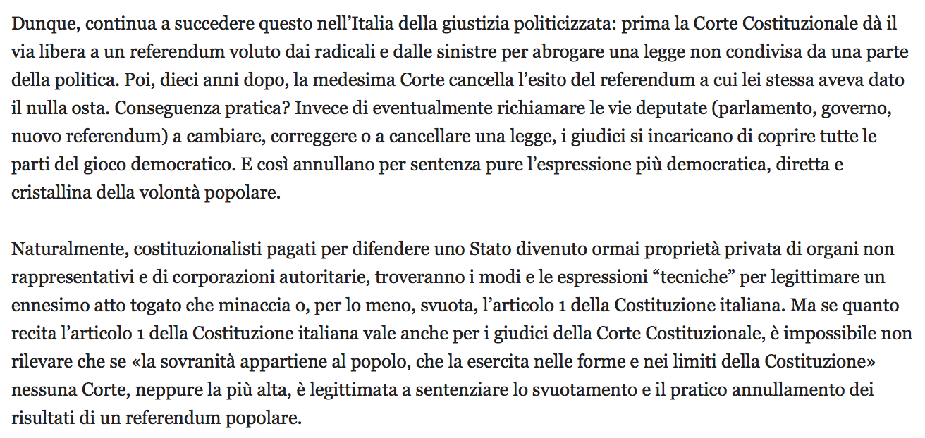 […] la sentenza è frutto della difesa strenua di alcuni ambienti cattolici della stessa legge. Se tuteli il male, questo non potrà che svilupparsi e portare frutto. La male pianta non può che essere sradicata al più presto. Detto in soldoni, il compromesso è la porta d’ingresso a mali ben peggiori.